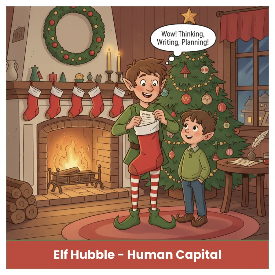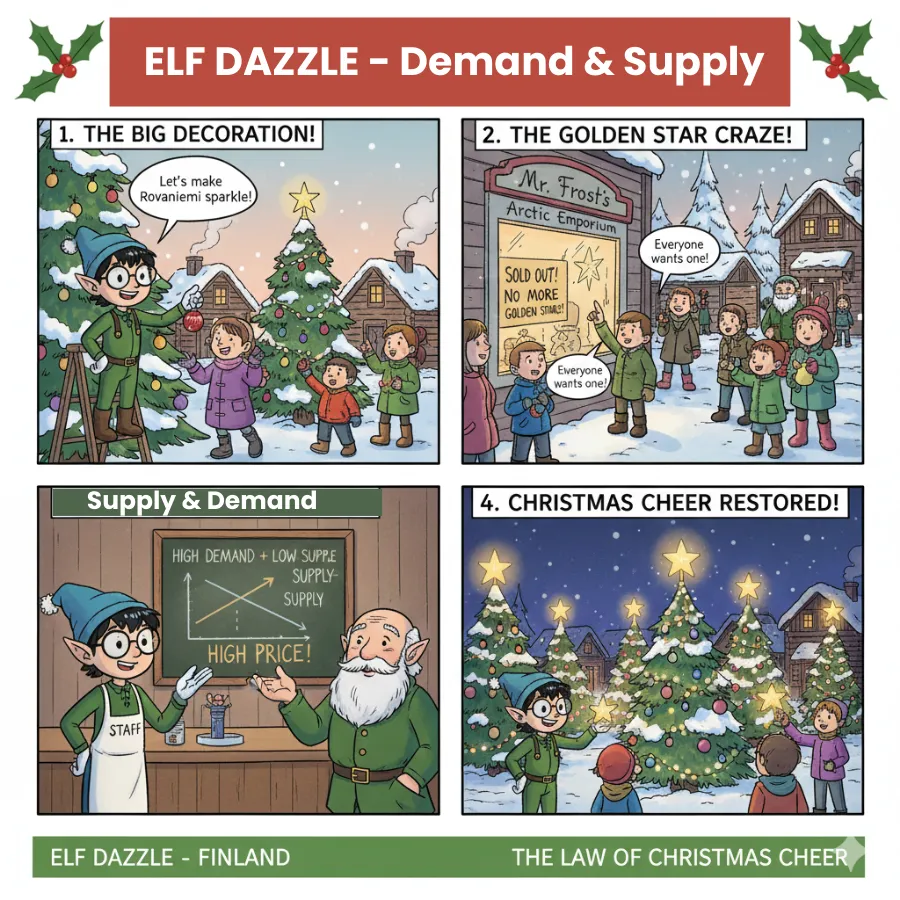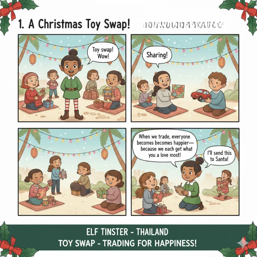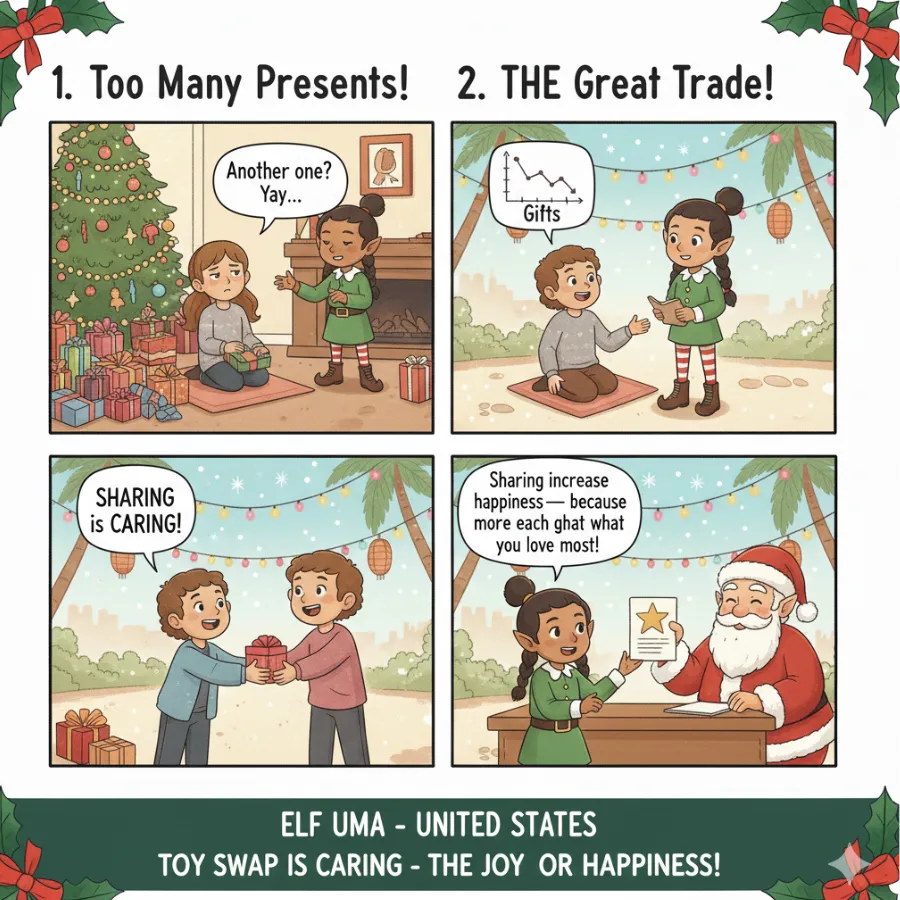 Elf Uma visited the United States and watched children unwrap their Christmas gifts and noticed something surprising — the first present made them super happy, the next a little less, and after many gifts, the excitement almost disappeared! But when one girl had a great idea to share her extra Christmas gifts with her cousin, both of them lit up with double joy. That night, Uma wrote in her report to Santa: “Humans have a cool subject called economics! It helps kids make smart choices, stay grateful, and become kinder people. Sharing increases happiness—even more than opening gifts!” And Santa proudly stamped her note with a golden star.
