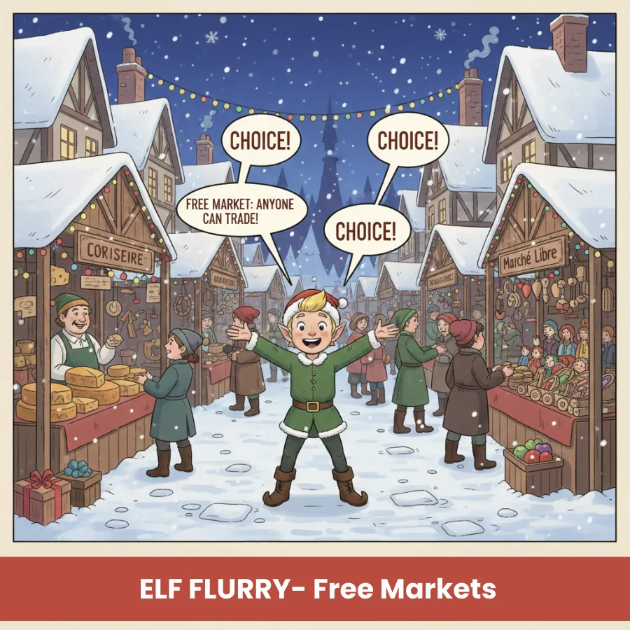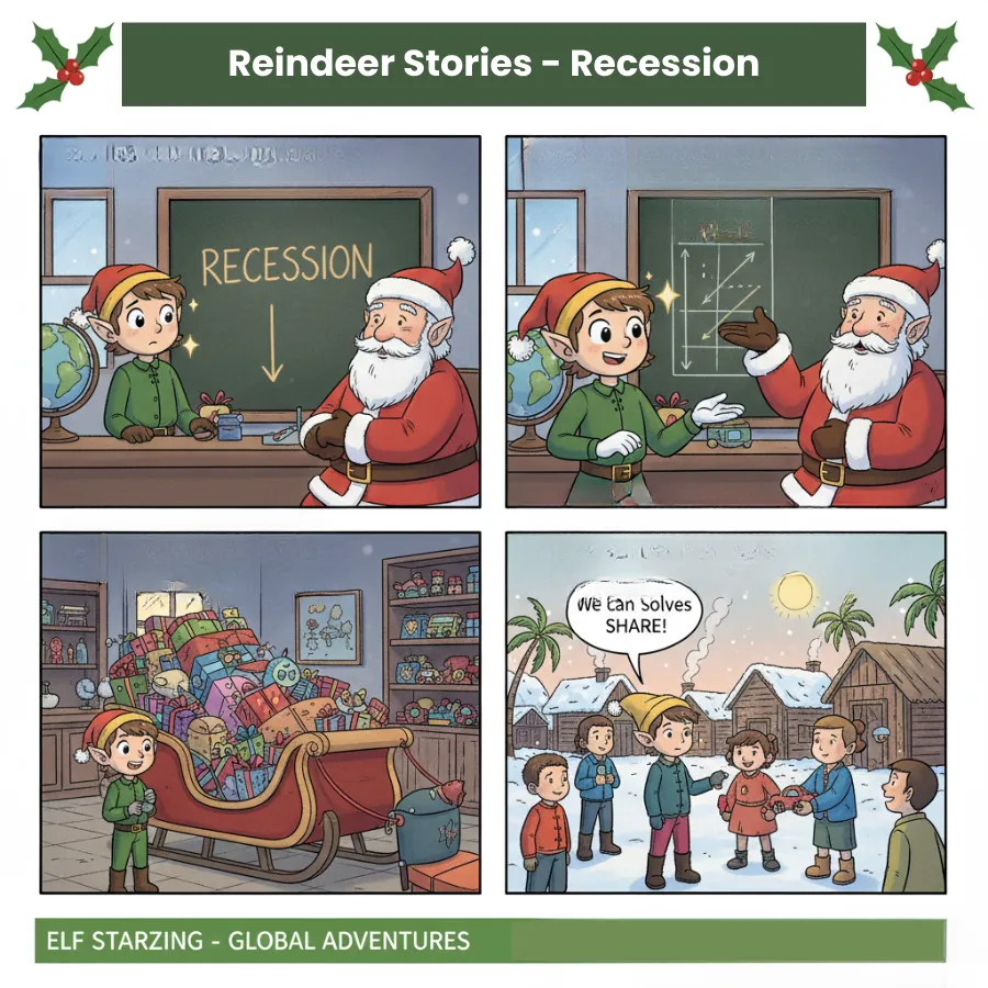 Elf Rudy worried when Santa talked about tough winters called “recessions,” but his eyes sparkled again when Santa explained how innovation, resilience, and clever new eco-toys help everyone bounce back. S – Santa’s Visit – Scarcity & Choices