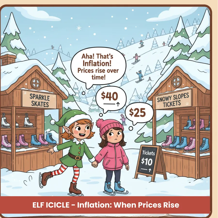 Elf Icicle zoomed after Isla into the shop, onto the ski slopes, everywhere! She noticed something curious: ice skates and skating tickets kept getting more expensive each time they looked. “Aha!” Icicle giggled. “That’s inflation, when prices rise over time!”