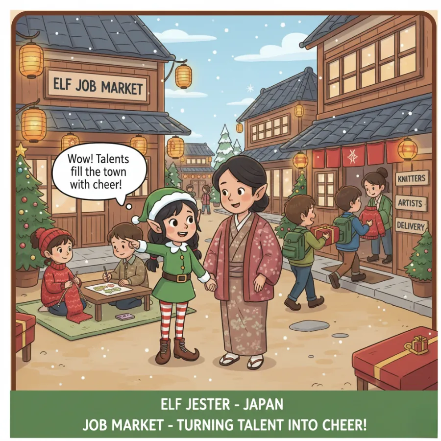 Elf Jester visited Japan and met Mrs Julia and the good kids of Jolly Town. The children were trying out a fun experiment with different jobs for the Elf Job Market – some knit, some draw, and some deliver cosy sweaters to their neighbours. Their talents fill the town with warm, bustling Christmas cheer! Jester smiled as he realised, he had been part of a job market too, just like in Santa’s Workshop.