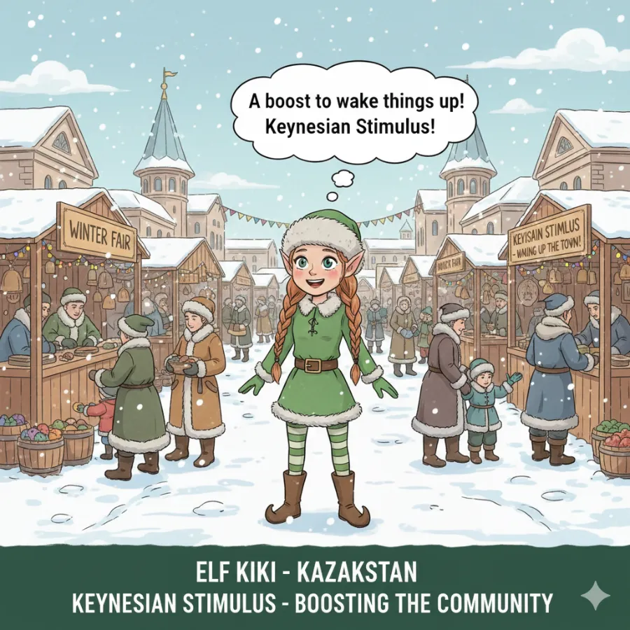 Elf Kiki visited snowy Kazakhstan, where the town had grown quietly in the cold weather, until a cheerful winter market fair brought everyone back outside, shopping, playing, and helping again. She discovered that sometimes a community needs a little boost to wake things up, which is exactly what Keynesian stimulus aims to do.