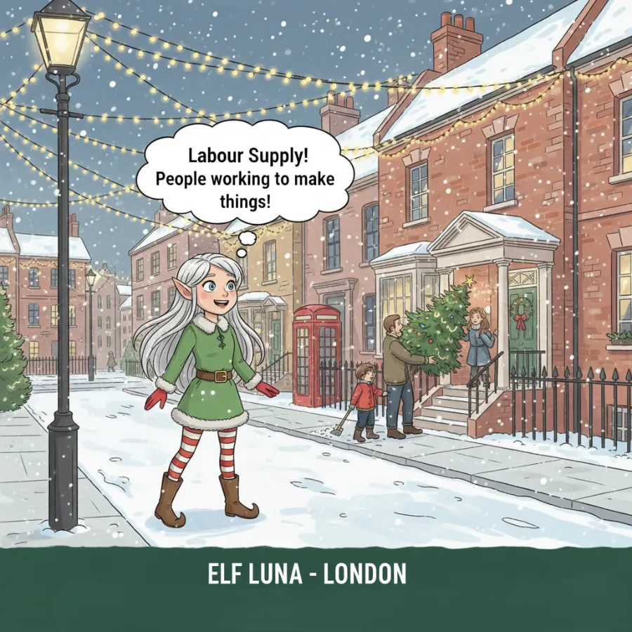 Elf Luna visited London, where dazzling Christmas lights shone everywhere. She wandered into a quiet street and found a family busily cleaning and decorating their home. By following little Lucy and Liam, Luna learns how labour supply works in real life!