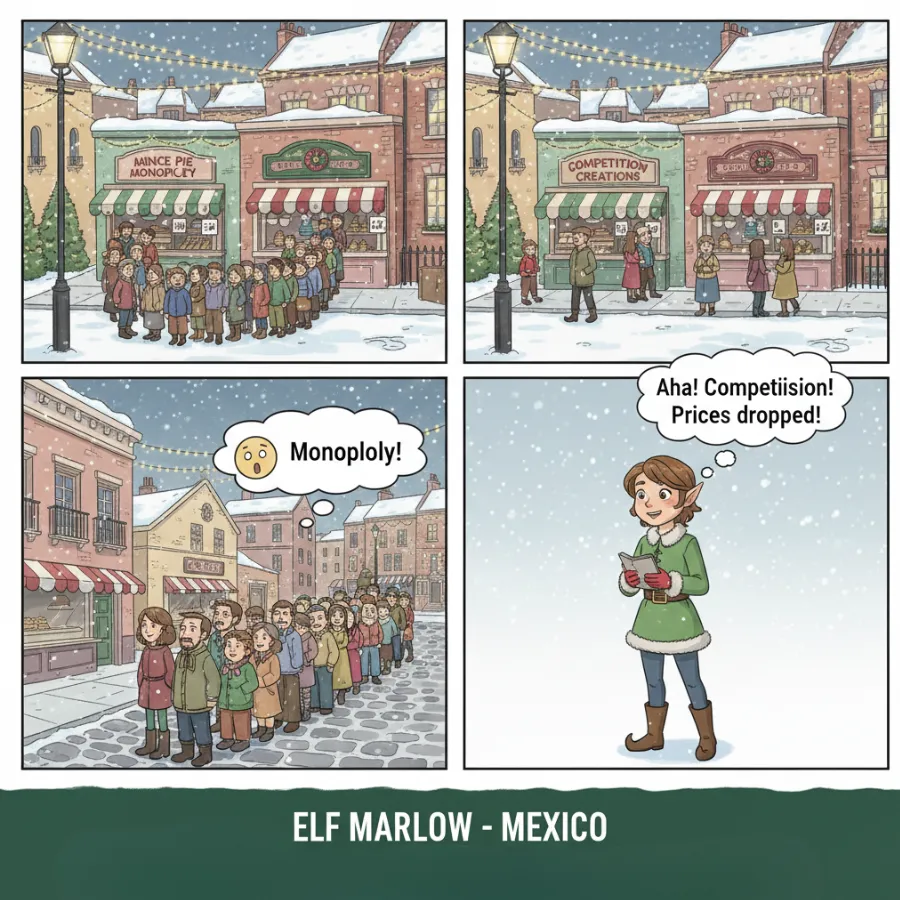 Elf Marlow visited Mexico and noticed a problem — only one bakery sells mince pies! The queue wound down the street, and prices were sky-high. But when a second bakery opened, the long queue disappeared, and prices dropped. Marlow laughed, realising he’s just seen monopoly and competition in action. He wrote it all down to report back to Santa as a new idea for the Santa Shop!