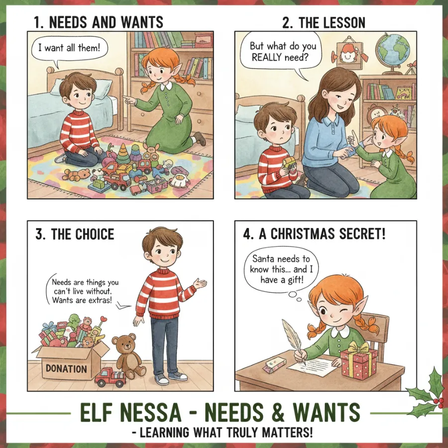 Elf Nessa visited Nathan and watched him sort his toys. Nathan—who has been on Santa’s good list for years—talked with his mum about needs and wants. When he chose what he truly needed, Nessa smiled brightly. “What a great economic lesson! I’ll tell Santa about it… and maybe send him a special gift,” she whispered.