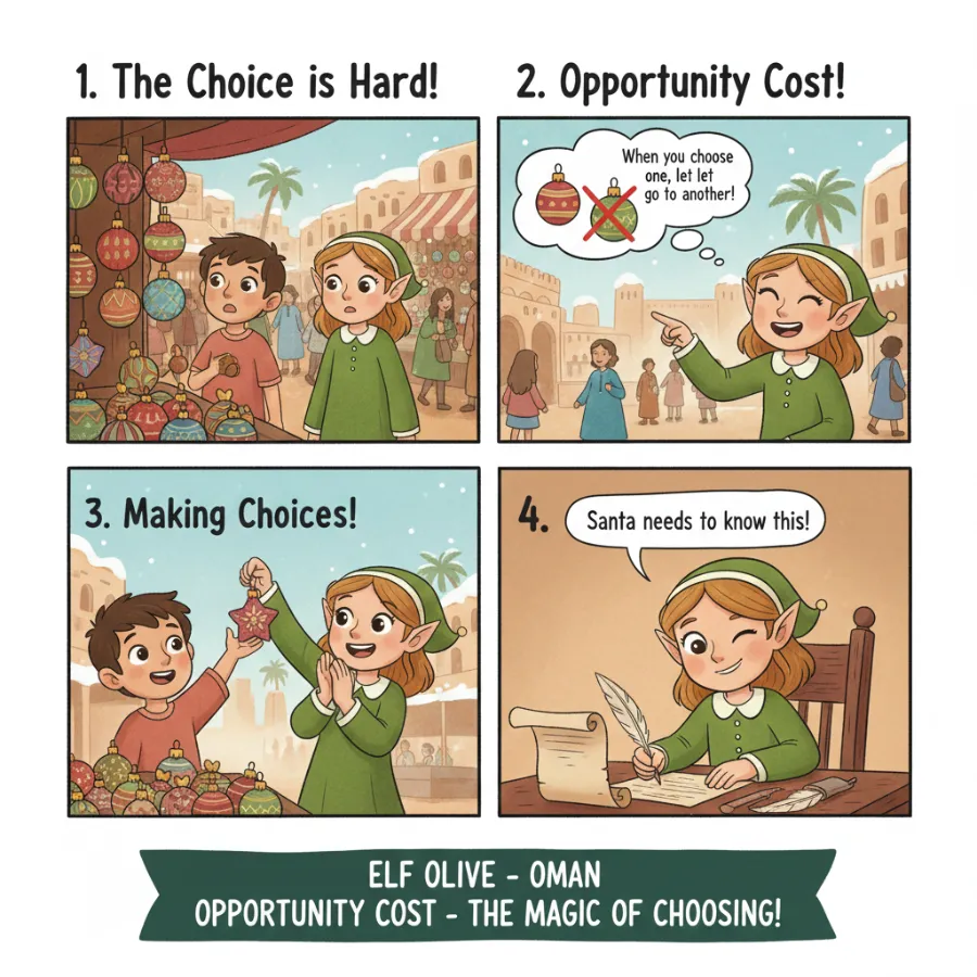 Elf Olive visited Oman and joined Oscar and his mum on their trip to town to pick the perfect ornament for the special spot on their Christmas tree. There were so many beautiful ornaments that choosing just one felt impossible! As Oscar selected his favourite, Olive learned something new — opportunity cost. “Pick your favourite branch,” she giggled, “but remember, when you choose one, you let go of another!” Olive thought it was such a clever idea that she couldn’t wait to tell Santa. And just like that, the children learned the magic of making choices.