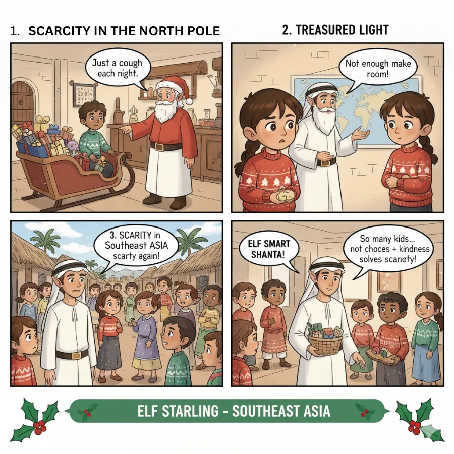 Santa explained that when we don’t have enough, we need to make good choices. On his next trip to Southeast Asia, Starling saw many children but not enough toys to go around. ‘Scarcity again!” he said. Then his eyes lit up. “I know! Some kids have extra toys they don’t use. If they share, we can help solve scarcity with smart choices and kindness!”