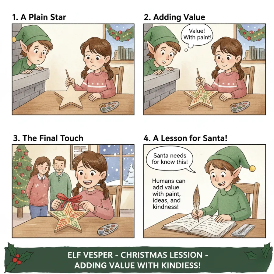 Elf Vesper peeked from the chimney and watched Violet transform a plain star. He scribbled in his notebook: ‘Humans can add value with paint, ideas, and kindness!’ and sent the report to Santa.