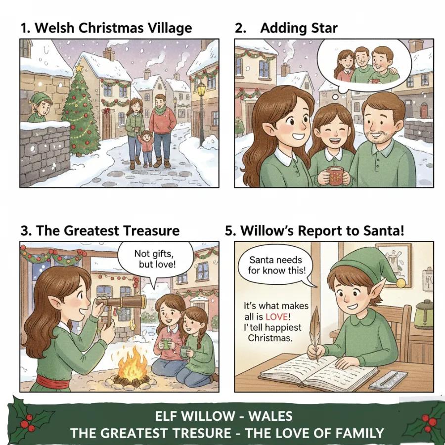 While exploring the cosy Christmas villages of Wales, Elf Willow noticed that the happiest moments came not from gifts, but from families walking together, talking, laughing, and sharing warmth. That’s when she learned the greatest treasure of all — love.