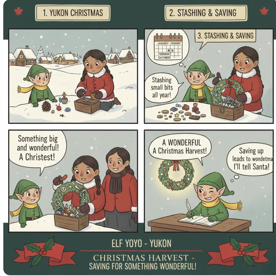 Elf Yoyo in Yukon realised that stashing small bits all year can lead to something big and wonderful—just like a real Christmas harvest!