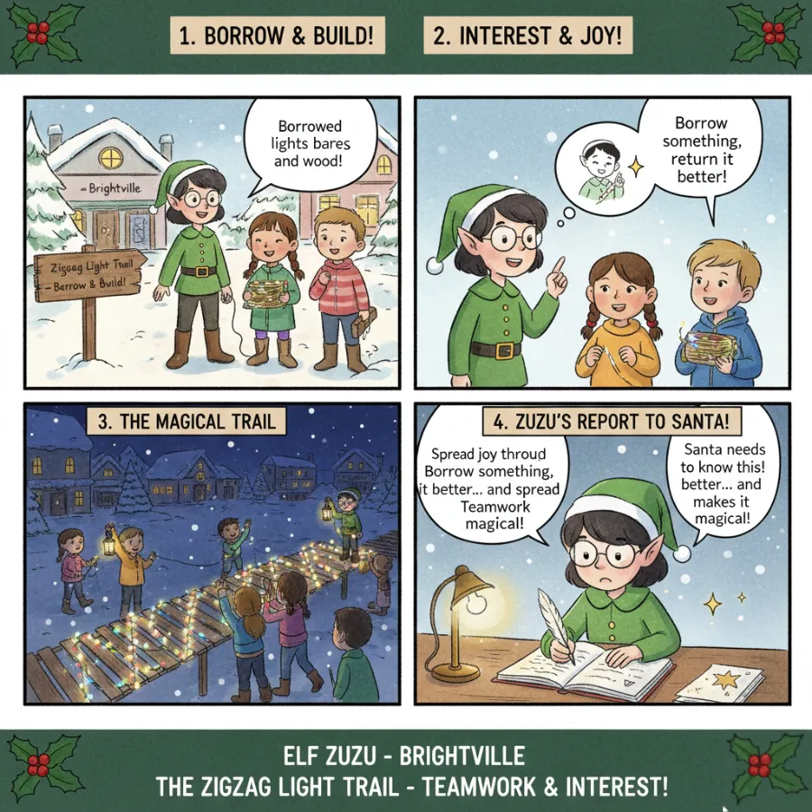 Elf Zuzu visited Brightville and joined kids building a magical Zigzag Light Trail. Using borrowed lights and wood, they learn how interest works like you borrow something, return it better, and spread joy through teamwork.